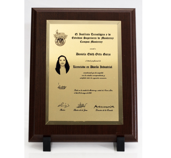 TITULO EN PLACA CON MADERA NEGRO O CAFÉ Y PLACA DORADA O PLATEADA A ELECCIÓN DEL CLIENTE