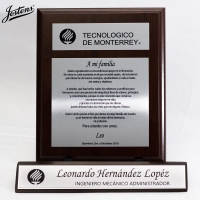 Hola, ¿Venden el reconocimiento sin el portanombre? Me gustaría comprar 4 reconocimientos con un mensaje personalizado. Me gustaría el que tiene el logo del tec en la esquina izquierda con el mensaje cortado en diagonal pero con la madera de color negro (código 2478-G). ¿Qué medidas tienen y qué precio me darían al ser 4?