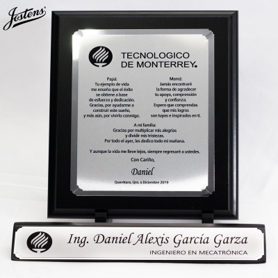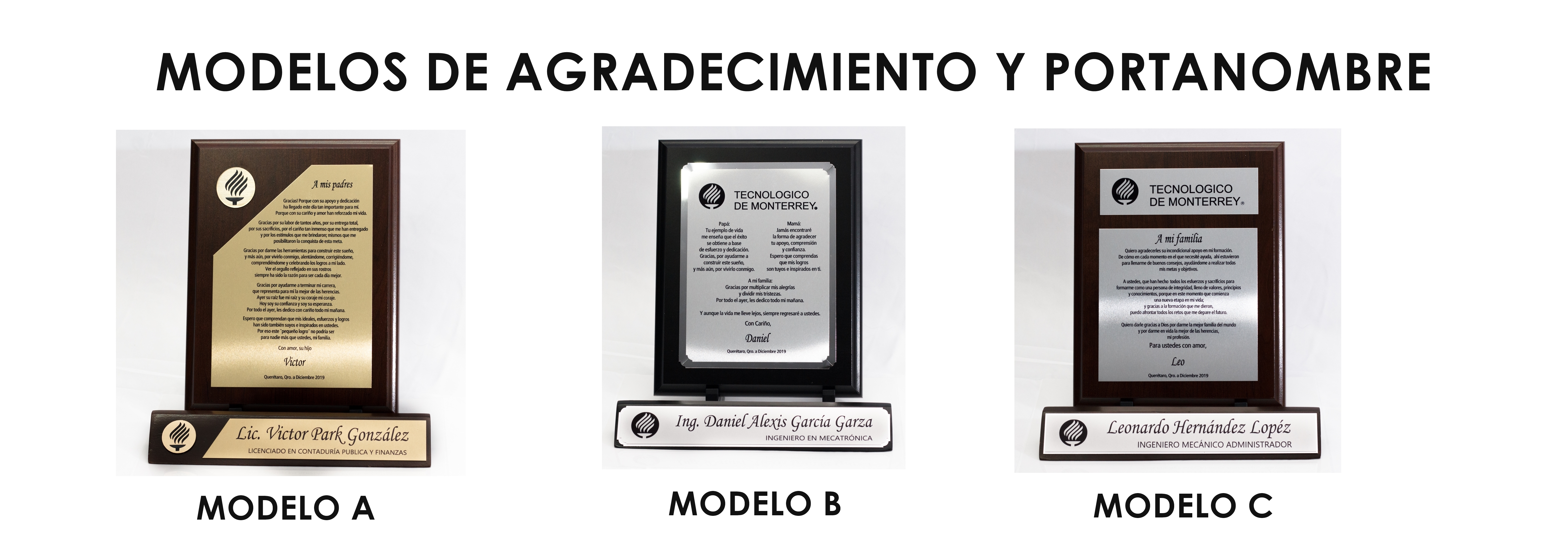 AGRADECIMIENTO Y PORTANOMBRE EN MODELOS A, B, C EN COLOR DE MADERA NEGRA O CAFÉ Y PLACA DORADA O PLATEADA.